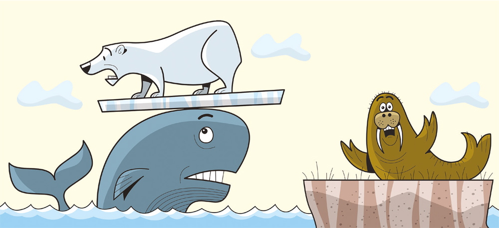 Belina Baleia subiu à superfície para respirar e (TUM!) bateu com a testa em algo inesperado: uma placa de gelo gigante. Ficou surpresa porque conhecia bem a região e não tinha visto aquela placa antes. Depois de verificar se não havia feito um galo na cabeça, Belina olhou novamente para a placa e percebeu que Lindomar, o urso polar, boiava assustado sobre ela. Observando a cena da terra firme, a morsa Heliodora gritou: – Estou avisando que essas mudanças climáticas estão complicando a vida por aqui, mas ninguém me ouve!