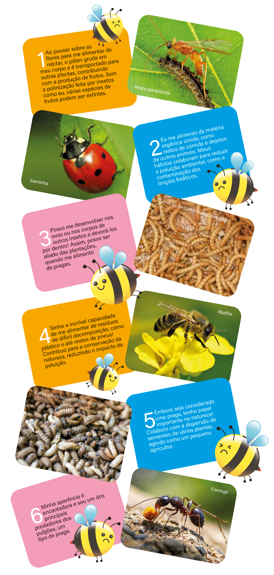 A abelha Zélia estava irritada, a ponto de dar uma ferroada no primeiro humano que aparecesse, de tanto ouvir que insetos só servem para perturbar. Ela respirou fundo, refletiu bastante e guardou o ferrão, porque lembrou que existem pessoas como você, que sabem dar valor aos insetos na natureza! Mas ela decidiu fazer um teste para ter certeza de que não está enganada a seu respeito. Preparou um jogo da memória com sentenças e imagens que formam pares. E aí? Você consegue formar os pares ou vai precisar correr da Zélia?