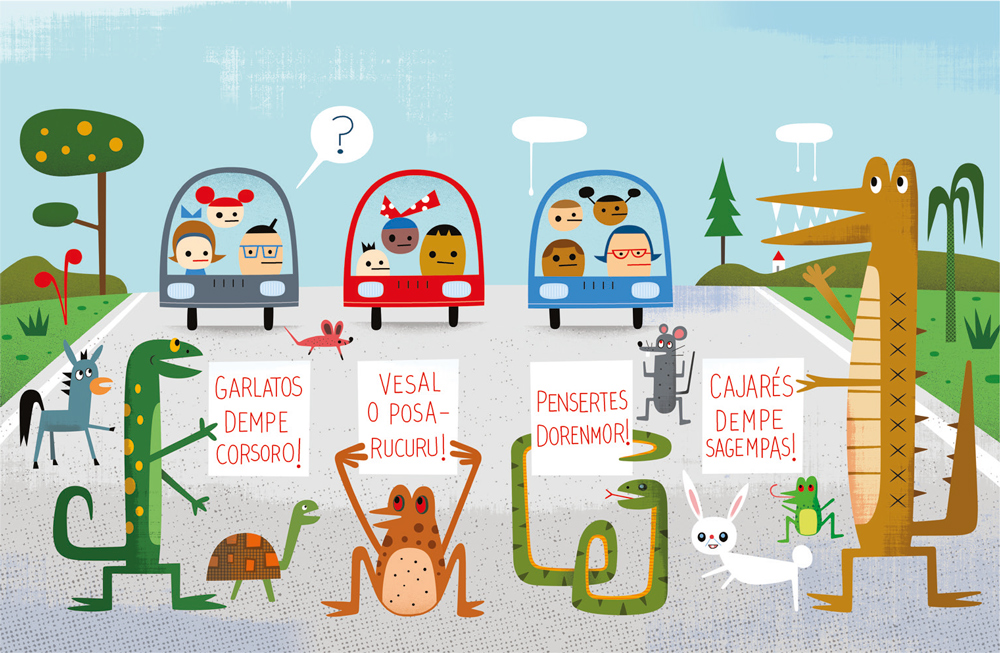Com tantos atropelamentos de seus parentes nas estradas, répteis e anfíbios resolveram organizar um protesto! Reuniram um grupo enorme de sapos, rãs, serpentes, jacarés, lagartos e outros bichos simpáticos à causa e interromperam o vai e vem de automóveis em uma grande rodovia. O engarrafamento está gigantesco, e os motoristas não estão entendendo muito bem a razão da manifestação, porque, nas palavras dos cartazes, as sílabas estão embaralhadas. Você consegue decifrar o que está escrito em cada um deles?