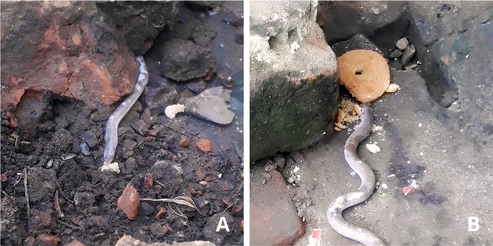 Uma anfisbena comendo pão (A) e biscoito (B), itens que não fazem parte da sua dieta na natureza.