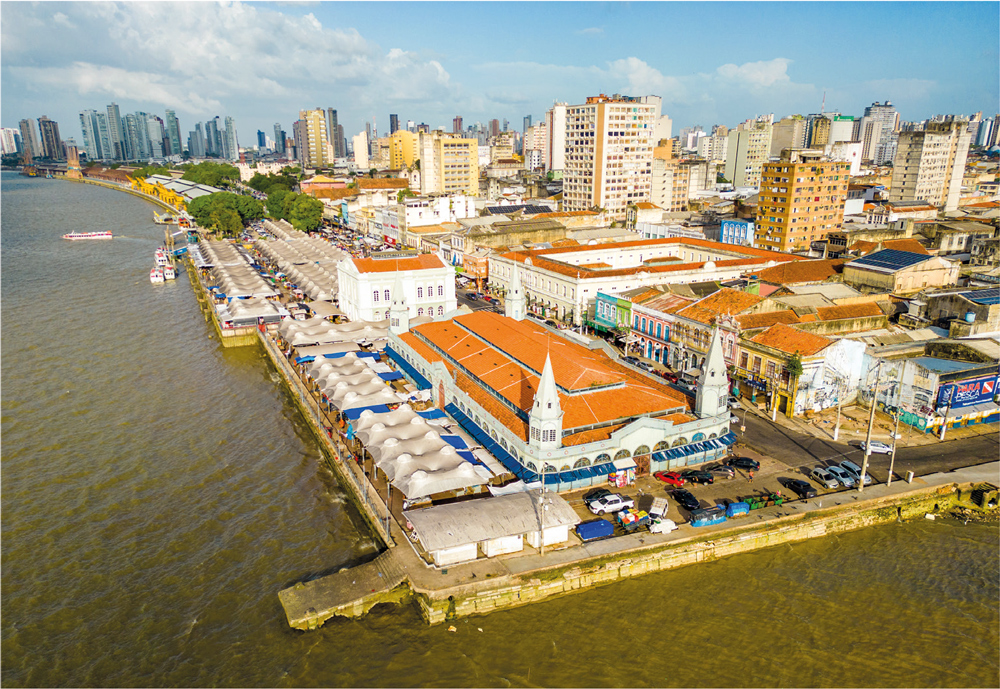 Vista aérea do mercado Ver-o-Peso, um dos mais antigos do Brasil e referência na venda de produtos regionais.
