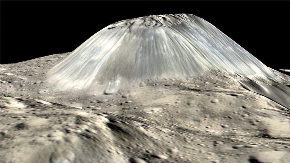 A missão Dawn da NASA, que orbitou Ceres entre 2015 e 2018, revelou uma superfície com evidências de montanhas e manchas brilhantes, sugerindo sinais de que, no passado (e talvez até hoje), materiais do interior saíram para a superfície. Um exemplo é o Ahuna Mons, uma montanha isolada com quase 4 quilômetros de altura, que parece ter se formado por uma “erupção gelada”. Esse tipo de erupção é chamada de criovulcão, que libera uma mistura de água, gelo, sal e lama fria.